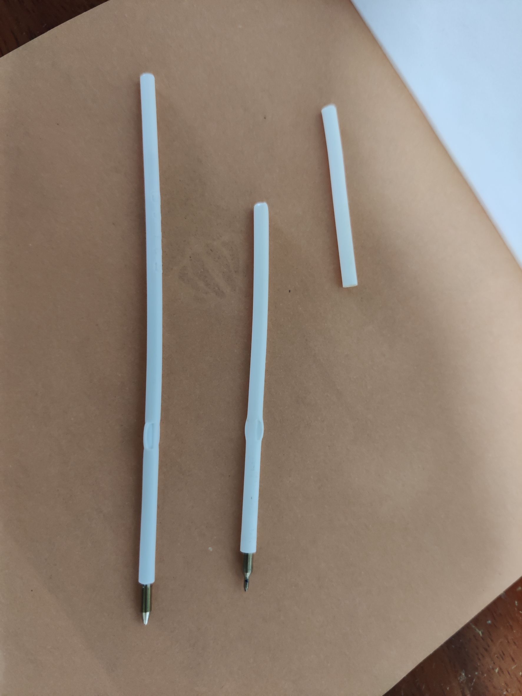 อะไรดีนะ…”ไส้ปากกา” (อันนี้ฉันเก็บไว้ ทำไมไม่รู้ -.-) ทากาวแปะ ๆ (ตัด 2 แท่ง 3 ส่วน ได้ 6 ชิ้น: