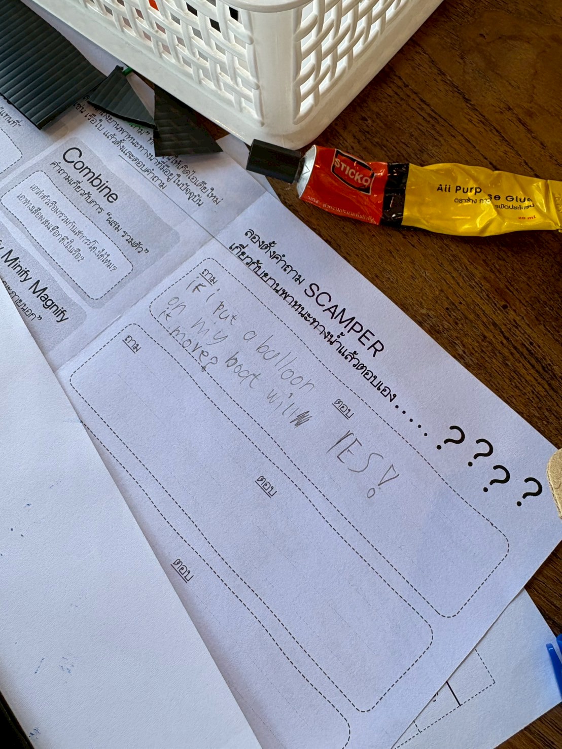 SCAMPER เป็นเทคนิค “การตั้งคำถาม” ที่กระตุ้นให้เกิดไอเดียใหม่ ระหว่างการทำ Box นี้จะได้ฝึกการตั้งและตอบคำถาม และลงมือทำยานพาหนะทางน้ำชิ้นเดียวในโลกที่มาจากกระบวนการการคิดอย่างมีระบบของตนเอง